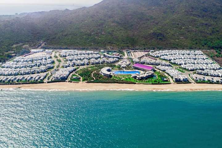 Cả khu du lịch nghỉ dưỡng Oceanami bao gồm 350 căn biệt thự đơn lập xếp thành hình sóng biển, nằm trọn bên bờ biển với một bên là tiếng sóng biển rì rào, du dương, một bên là dãy núi Minh Đạm sừng sững xanh mát.