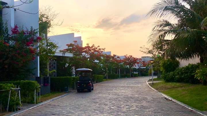 Giữa các dãy biệt thự là những con đường với hàng cây xanh mướt, mát mẻ, khiến cả khu resort thật thơ mộng và lãng mạn.